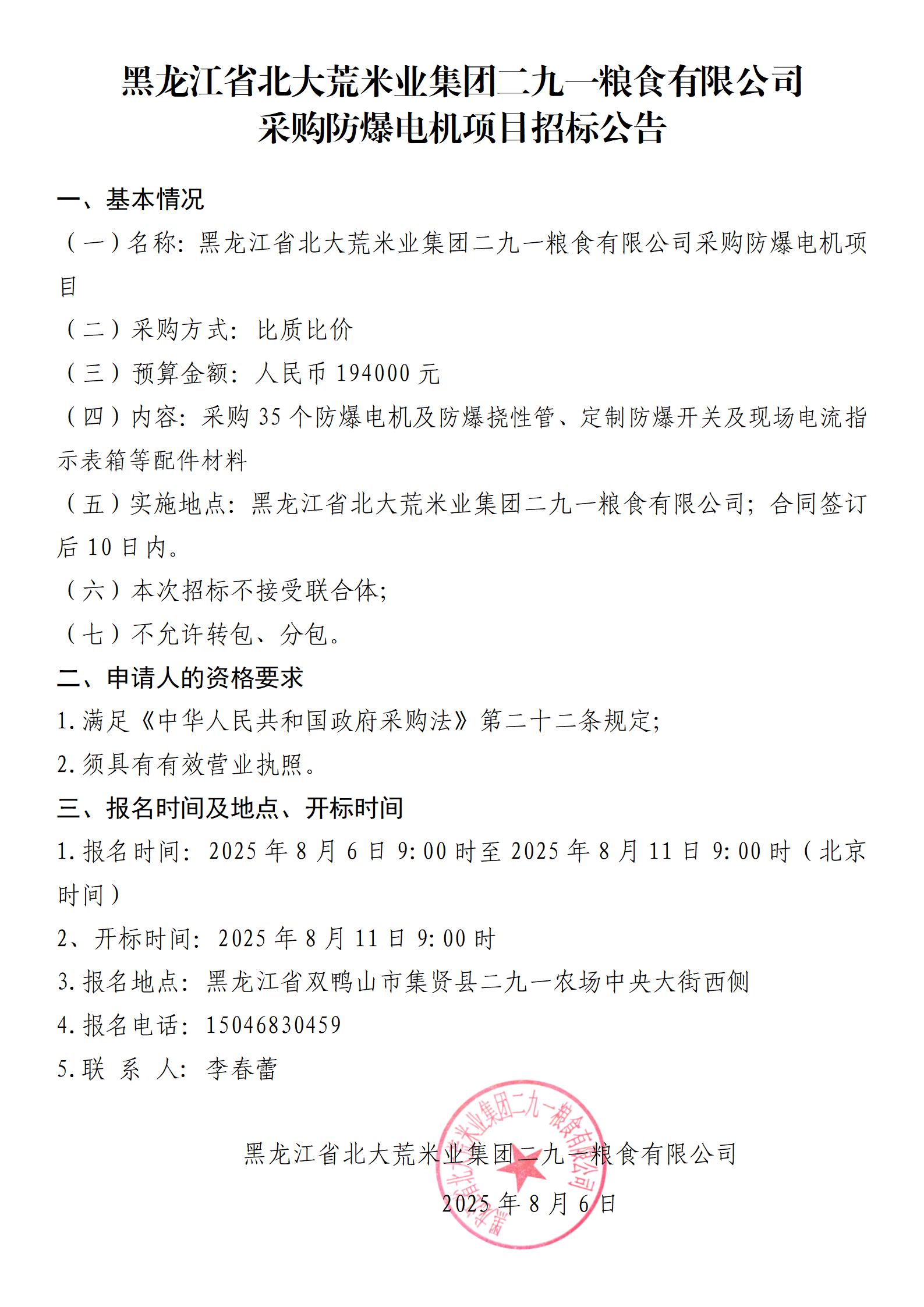 黑龍江省北大荒米業(yè)集團(tuán)二九一糧食有限公司采購防爆電機(jī)項(xiàng)目招標(biāo)公告