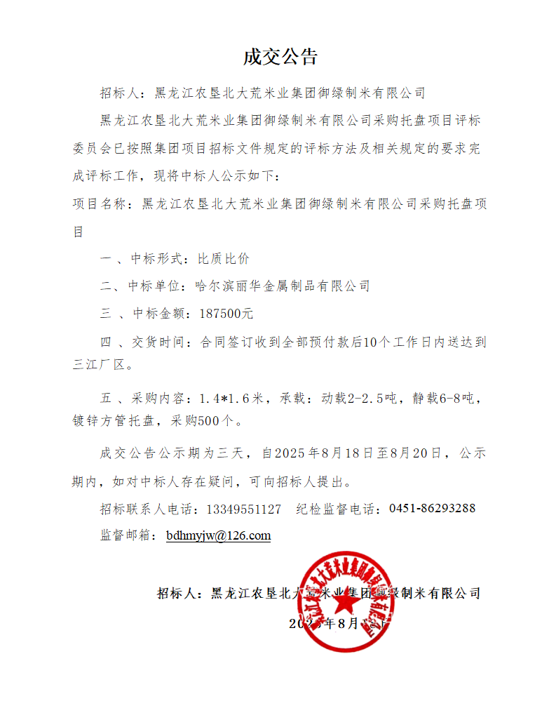 托盤項(xiàng)目成交公告