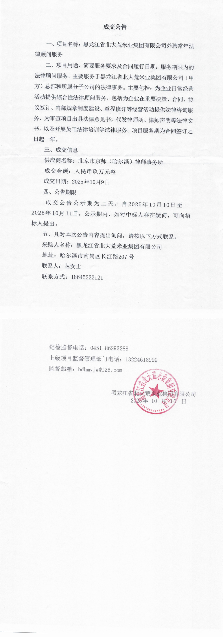 黑龍江省北大荒米業集團有限公司外聘常年法律顧問服務成交公告