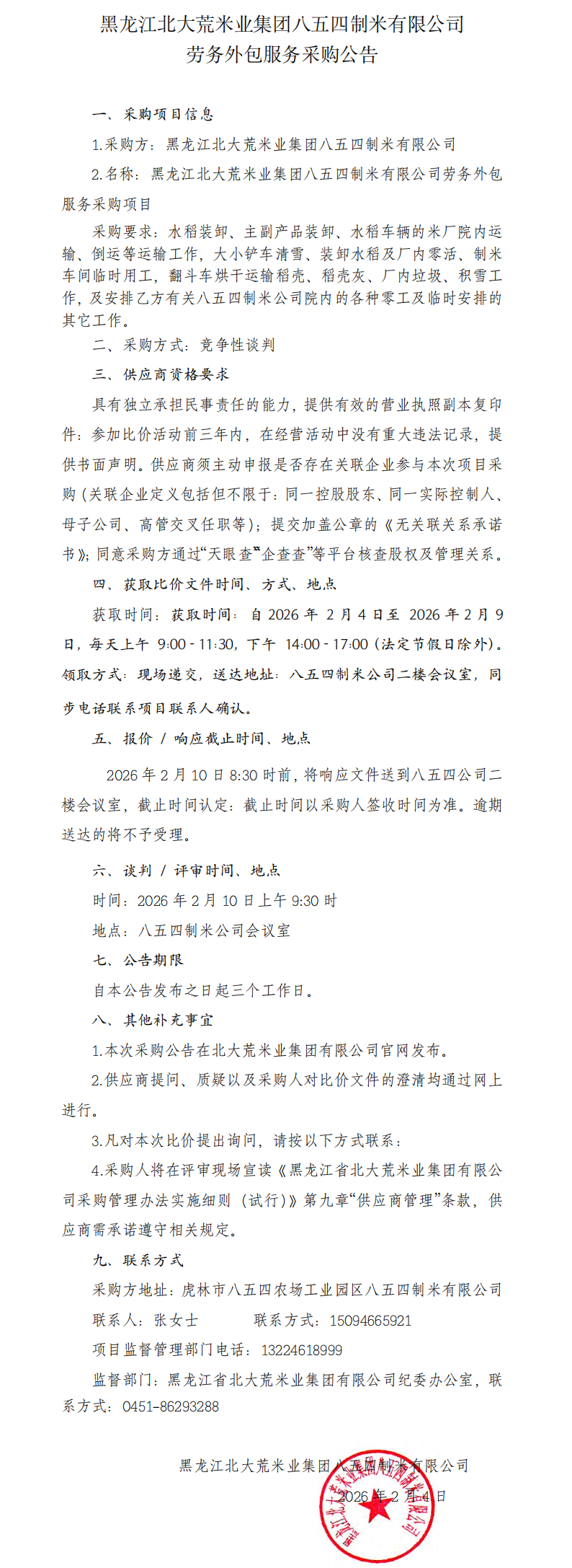 黑龍江北大荒米業(yè)集團八五四制米有限公司勞務(wù)外包服務(wù)采購公告