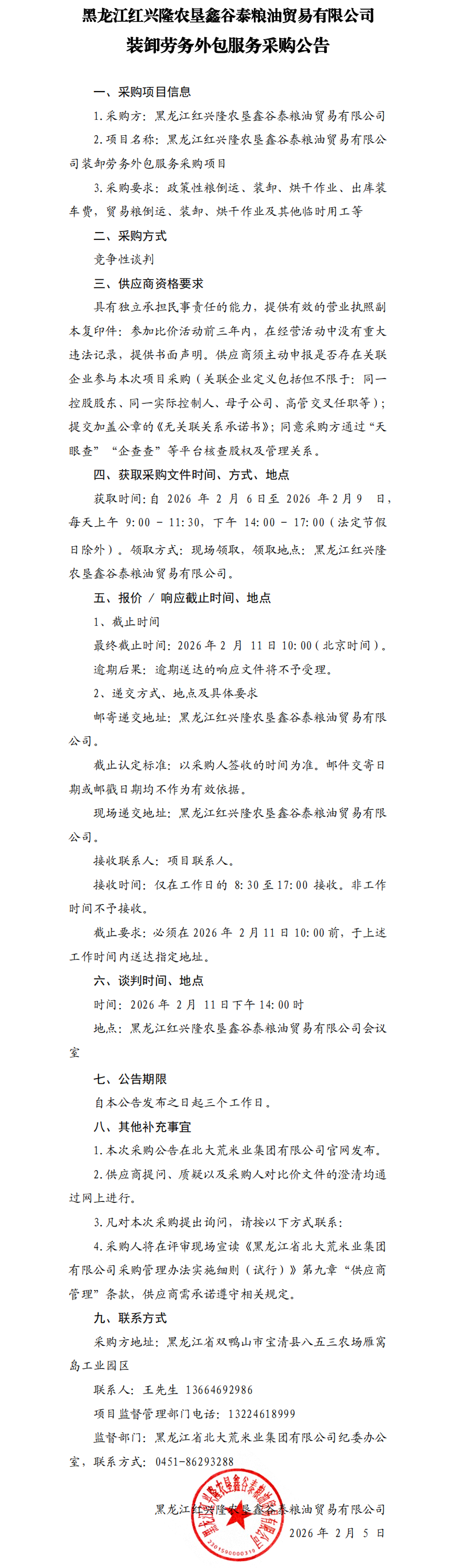 黑龍江紅興隆農(nóng)墾鑫谷泰糧油貿(mào)易有限公司裝卸勞務(wù)外包服務(wù)項目采購公告