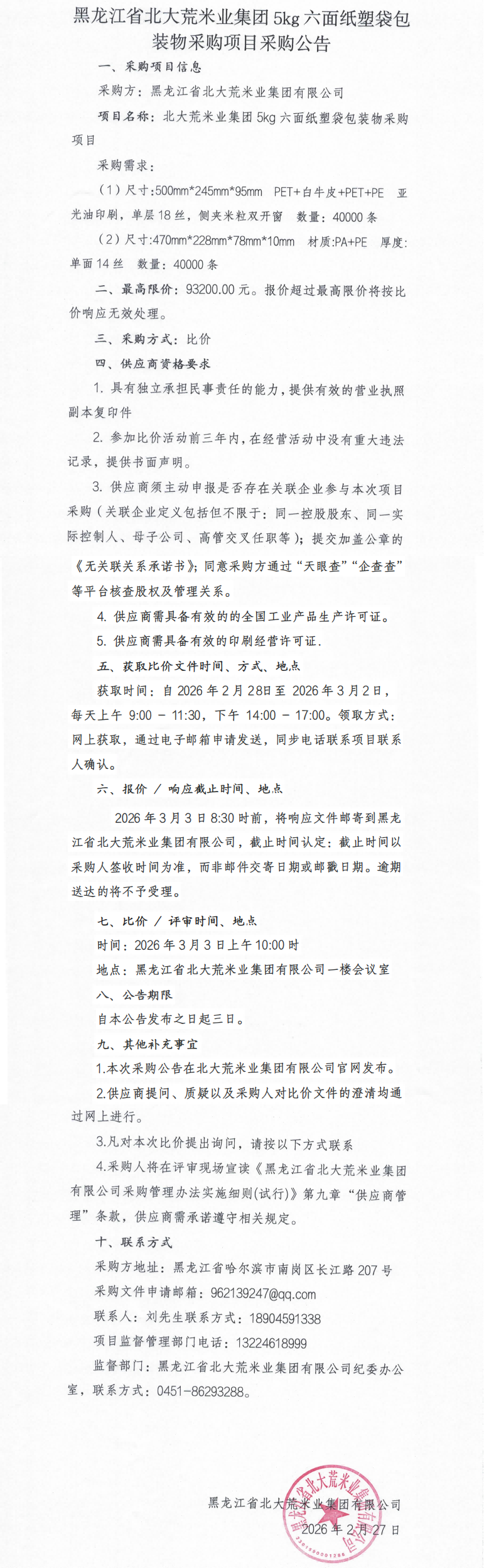 黑龍江省北大荒米業集團5kg六面紙塑袋包裝物采購項目采購公告